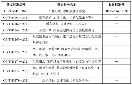 2021年發(fā)布的GB/T 6546—2021《瓦楞紙板 邊壓強(qiáng)度的測(cè)定》等9項(xiàng)造紙領(lǐng)域國(guó)家標(biāo)準(zhǔn)已于本月實(shí)施,請(qǐng)各相關(guān)單位積極執(zhí)行新標(biāo)準(zhǔn)。