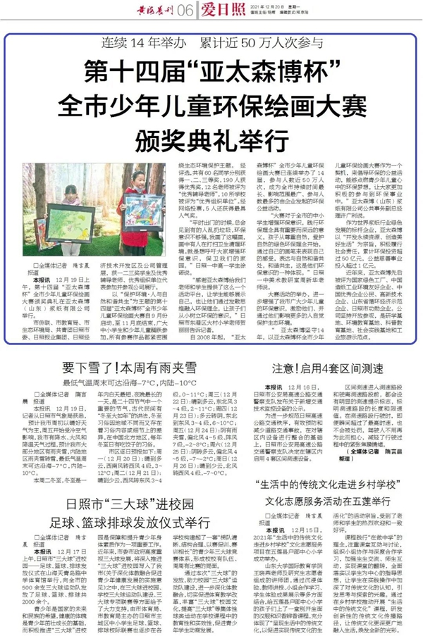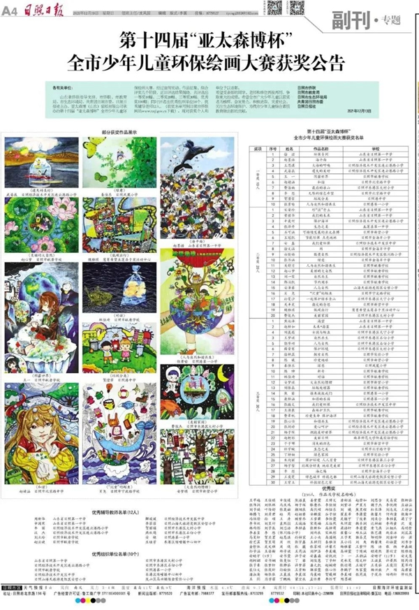 《日照日報(bào)》 整版公告 12月19日上午 第十四屆“亞太森博杯” 全市少年兒童環(huán)保繪畫大賽頒獎(jiǎng)典禮 在亞太森博(山東)漿紙有限公司舉行