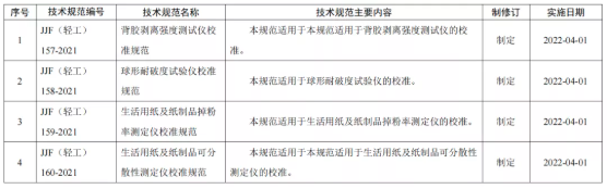 2021年12月22日,工業和信息化部〔2021〕33號公告批準發布了513項行業標準,123項行業計量技術規范。其中,造紙領域5項行業標準(表1)和4項計量技術規范(表2)正式發布,并將于2022年4月1日實施,請各相關單位積極實施新標準。