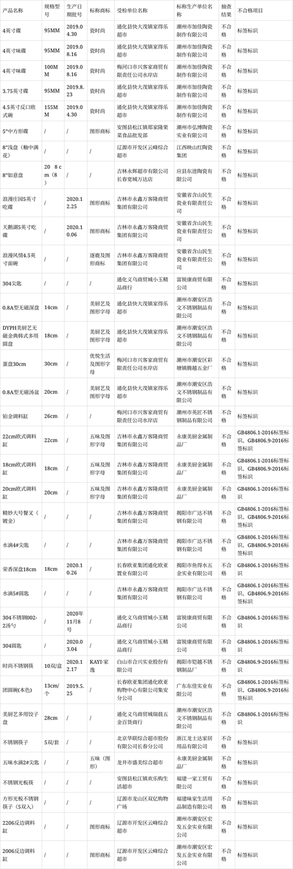通告稱,依據《中華人民共和國產品質量法》《產品質量監督抽查管理暫行辦法》的規定,2021年3季度,吉林省市場監督管理廳組織開展了啤酒瓶、密胺餐具、食品接觸用塑料包裝(膜袋、容器、工具、編織袋)、食品接觸用玻璃制品、食品接觸用紙制品、食品接觸用金屬材料及制品、食品接觸用陶瓷餐(飲)具等7種產品質量監督抽查,共抽查151家企業生產、銷售的450批次產品。經檢測,15家企業生產、銷售的35批次產品質量不合格,不合格發現率為7.73%。