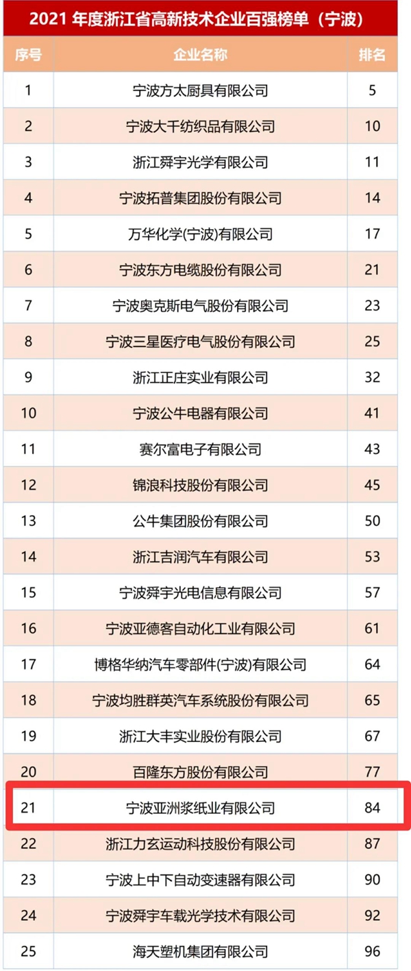 元旦前夕,從寧波市科技局傳來消息,2021年度浙江省高新技術(shù)企業(yè)創(chuàng)新能力百強(qiáng)和各領(lǐng)域十強(qiáng)榜單日前發(fā)布,寧波亞洲漿紙業(yè)榮登“2021年度浙江省高新技術(shù)企業(yè)創(chuàng)新能力百強(qiáng)榜”第84位,連續(xù)第二年入圍百強(qiáng)榜。寧波25家企業(yè)入圍,北侖區(qū)擁有8家,位列全省第二。寧波亞漿多年來堅持科技引領(lǐng)、創(chuàng)新發(fā)展,尤其在數(shù)字化轉(zhuǎn)型、智能制造方面,以市場為導(dǎo)向,以新品研發(fā)品牌建設(shè)為抓手,以四輪驅(qū)動科技創(chuàng)新為動力,不斷推進(jìn)公司高質(zhì)量發(fā)展。