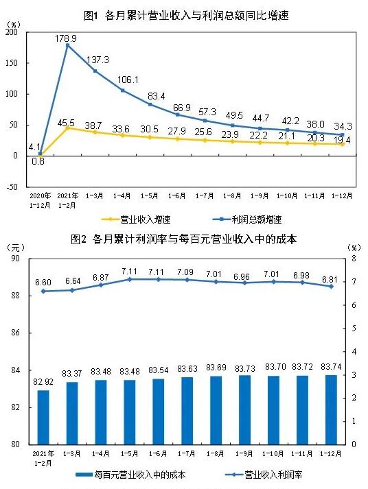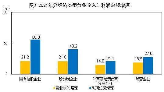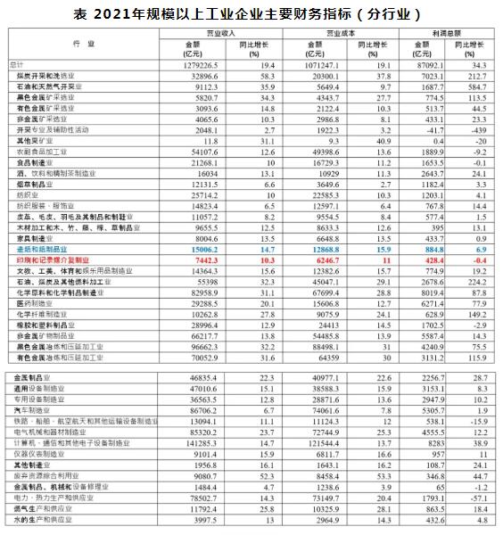 1月27日,國家統計局網站發布了2021年全國規模以上工業企業利潤數據。數據顯示,2021年全國規模以上工業企業利潤增長34.3%,兩年平均增長18.2%。 2021年,全國規模以上工業企業實現利潤總額87092.1億元,比上年增長34.3%,比2019年增長39.8%,兩年平均增長18.2%。 2021年,規模以上工業企業中,國有控股企業實現利潤總額22769.7億元,比上年增長56.0%;股份制企業實現利潤總額62702.2億元,增長40.2%;外商及港澳臺商投資企業實現利潤總額22845.5億元,增長21.1%;私營企業實現利潤總額29150.4億元,增長27.6%。 2021年,采礦業實現利潤總額10390.8億元,比上年增長1.91倍;制造業實現利潤總額73612.2億元,增長31.6%;電力、熱力、燃氣及水生產和供應業實現利潤總額3089.2億元,下降41.9%。 2021年,在41個工業大類行業中,32個行業利潤總額比上年增長,8個行業下降,1個行業由盈轉虧。 2021年,規模以上工業企業實現營業收入127.92萬億元,比上年增長19.4%;發生營業成本107.12萬億元,增長19.1%;營業收入利潤率為6.81%,比上年提高0.76個百分點。 2021年末,規模以上工業企業資產總計141.29萬億元,比上年增長9.9%;負債合計79.23萬億元,增長9.6%;所有者權益合計62.06萬億元,增長10.2%;資產負債率為56.1%,比上年降低0.1個百分點。 2021年末,規模以上工業企業應收賬款18.87萬億元,比上年增長13.3%;產成品存貨5.40萬億元,增長17.1%。 2021年,規模以上工業企業每百元營業收入中的成本為83.74元,比上年減少0.23元;每百元營業收入中的費用為8.59元,比上年減少0.59元。 2021年末,規模以上工業企業每百元資產實現的營業收入為95.4元,比上年增加7.7元;人均營業收入為172.0萬元,比上年增加28.4萬元;產成品存貨周轉天數為16.8天,比上年減少0.9天;應收賬款平均回收期為49.5天,比上年減少2.0天。 2021年12月份,規模以上工業企業實現利潤總額7342.0億元,同比增長4.2%。