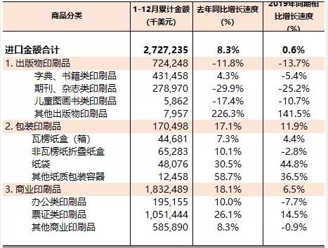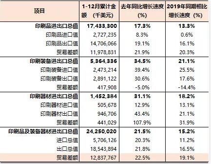 同期,國內印刷器材進出口貿易順差4.41億美元(同比增長107.9%、較2019年同期增長31.9%)。 本期觀察 總結: 2021年1-12月國內印刷產業相關商品進出口總值達242.50億美元。同期,印刷品、印刷裝備、印刷器材三大類商品進出口均實現穩定持續增長,三類商品的進口和出口規模不僅超越2020年同期水平,且較2019年同期也有較大幅度增長: 與2020年同期相比,國內印刷品進口增長8.3%、出口增長19.1%;印刷裝備進口增長39.4%、出口增長30.6%;印刷器材進口增長12.9%、出口增長43.4%; 與2019年同期相比,其中,國內印刷品進口增長0.6%、出口增長16.1%;印刷裝備進口增長25.5%、出口增長17.6%;印刷器材進口增長13.1%、出口增長21.1%。 與2020年同期相比,2021年1-12月國內印刷品、印刷裝備、印刷器材進口、出口增長較快的前五位商品類別如下: 進口:其他出版物印刷品(+226.3%)、印刷輔機和零件(+61.2%)、其他紙質包裝容器(+58.7%)、膠印機(+50.5%)、計算機直接制版機(+47.7%); 出口:印刷輔機和零件(+76.6%)、票證類印刷品(+63.4%)、CTP膠印版材(+49.7%)、其他印刷油墨(+38.7%)、水性噴墨墨水/PS膠印版材(+38.2%)。 同期,國內印刷品、印刷裝備、印刷器材進出口相對萎縮的商品類別如下: 進口:柔版印刷機(-45.6%)、 凹版印刷機(-39.7%)、期刊雜志類印刷品(-29.9%)、凸版印刷機(-27.1%)、兒童圖畫書類印刷品(-17.4%)、包裝印后設備(-15.4%); 出口:辦公類印刷品(-6.0%)。 有關2021年國內印刷產業進出口商品的規模、結構、分布的特點、與以往年份相比國內印刷產業進出口商品的規模、結構、分布的變化、相關商品子項進出口數量和價格的詳細信息,近期推出的《2021年國內印刷產業相關產品進出口年度報告》將進行深入分析探討。同時,2022年1月1日開始實施的《區域全面經濟伙伴關系協定》(RCEP)對國內印刷產業進出口商品的影響也將在年度報告中有專題討論。敬請關注!