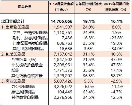 同期,國內印刷品出口147.06億美元(參見表3),同比增長19.1%、較2019年同期增長16.1%。其中,出版物印刷品出口19.42億美元(同比增長24.0%、較2019年同期增長8.0%)、包裝印刷品出口71.57億美元(同比增長31.1%、較2019年同期增長40.3%)、商業印刷品出口56.07億美元(同比增長5.3%、較2019年同期下降2.9%)。 相關印刷品主要子項出口,字典書籍類印刷品11.11億美元(同比增長24.9%、較2019年同期增長1.9%)、期刊雜志類印刷品743.6萬美元(同比增長16.3%、較2019年同期下降23.8%)、兒童圖畫書類印刷品8.07億美元(同比增長23.5%、較2019年同期增長19.8%)、瓦楞紙盒(箱)18.48億美元(同比增長21.5%、較2019年同期增長47.0%)、非瓦楞紙折疊紙盒22.09億美元(同比增長33.4%、較2019年同期增長47.6%)、紙袋17.71億美元(同比增長35.6%、較2019年同期增長17.4%)、辦公類印刷品32.26億美元(同比下降6.0%、較2019年同期下降11.4%)、票證類印刷品1.04億美元(同比增長63.4%、較2019年同期下降4.7%)、其他商業印刷品22.77億美元(同比增長降24.5%、較2019年同期增長12.5%)。 表3 2021年1-12月 國內印刷品出口統計