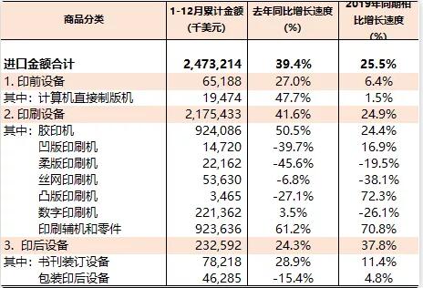 同期,國內印刷品進出口貿易順差119.79億美元(同比增長21.9%、較2019年同期增長20.3%)。 國內印刷裝備進出口概況 2021年1-12月國內印刷裝備進口24.73億美元(參見表4),與去年同期相比增長39.4%、較2019年同期增長25.5%。其中,印前設備進口0.65億美元(同比增長27.0%、較2019年同期增長6.4%)、印刷設備進口21.75億美元(同比增長41.6%、較2019年同期增長24.9%)、印后設備進口2.33億美元(同比增長24.3%、較2019年同期增長37.8%)。 相關設備主要子項進口,計算機直接制版機1947.4萬美元(同比增長47.7%、較2019年同期增長1.5%)、膠印機9.24億美元(同比增長50.5%、較2019年同期增長24.4%)、凹版印刷機1472.0萬美元(同比下降39.7%、較2019年同期增長16.9%)、柔版印刷機2216.2萬美元(同比下降45.6%、較2019年同期下降19.5%)、絲網印刷機5363.0萬美元(同比下降6.8%、較2019年同期下降38.1%)、凸版印刷機346.5萬美元(同比下降27.1%、較2019年同期增長72.3%)、數字印刷機2.21億美元(同比增長3.5%、較2019年同期下降26.1%)、印刷輔機和零件9.24億美元(同比增長61.2%、較2019年同期增長70.8%)、書刊裝訂設備7821.8萬美元(同比增長28.9%、較2019年同期增長11.4%)、包裝印后設備4628.5萬美元(同比下降15.4%、較2019年同期增長4.8%)。 表4 2021年1-12月 國內印刷裝備進口統計
