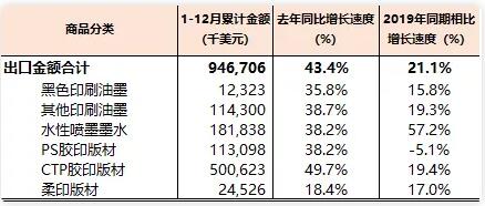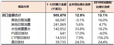 同期,國內印刷裝備進出口貿易順差4.18億美元(同比下降15.0%、較2019年同期下降14.4%)。 國內印刷器材進出口概況 2021年1-12月國內印刷器材進口5.06億美元(參見表6),同比增長12.9%、較2019年同期增長13.1%。其中,黑色印刷油墨1980.72噸、6604.7萬美元(同比下降0.1%、較2019年同期增長16.0%)、其他印刷油墨8808.52噸、2.42億美元(同比增長5.6%、較2019年同期增長4.7%)、水性噴墨墨水7310.93噸、1.43億美元(同比增長33.8%、較2019年同期增長18.2%)、PS膠印版材3.22萬平方米、64.1萬美元(同比增長17.0%、較2019年同期下降4.0%)、CTP膠印版材319.30萬平方米、1453.3萬美元(同比增長7.9%、較2019年同期增長156.2%)、柔印版材75.67萬平方米、3973.5萬美元(與上年增長24.5%、較2019年同期增長24.4%)。 表6 2021年1-12月 國內印刷器材進口統計