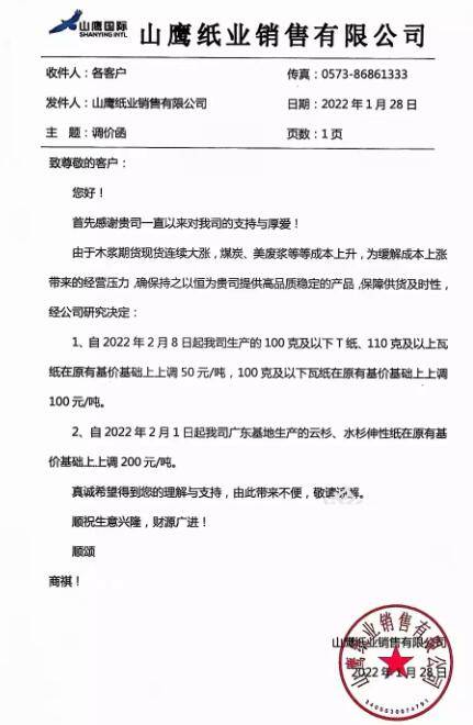 緊接著,廣東、河北、江蘇等地傳來新的紙價上漲消息。2月8日,玉田縣順發(fā)實(shí)業(yè)發(fā)布漲價函,宣布所有克重及品項(xiàng)的成品紙上調(diào)50元/噸;2月10日,東莞建暉紙業(yè)各種等級環(huán)保牛皮箱板紙銷售價格在原價格的基礎(chǔ)上上漲¥100元/噸。 玉田縣順發(fā)實(shí)業(yè)有限公司: