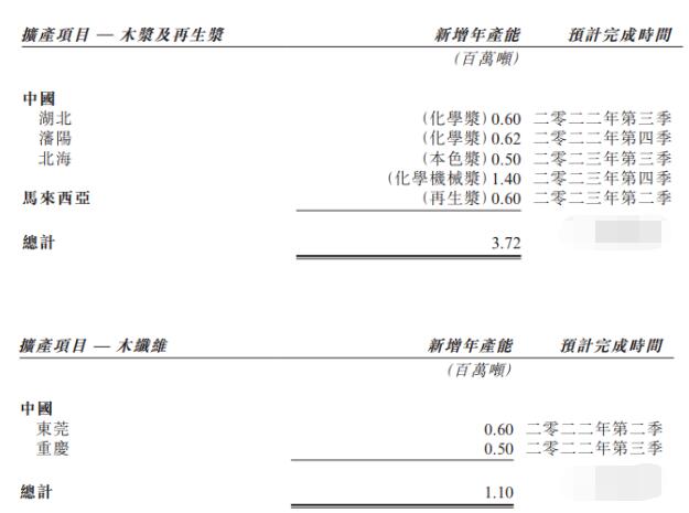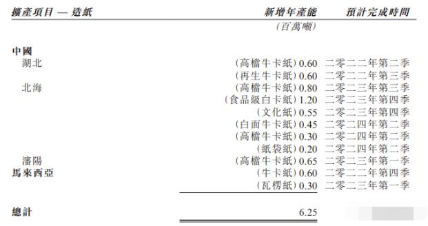 截至 2021年12月31日止,集團(tuán)造紙總設(shè)計(jì)年產(chǎn)能為1757萬噸。預(yù)計(jì)于2022年,位于湖北新基地的120萬噸及馬來西亞基地的60萬噸卡紙產(chǎn)能將可投產(chǎn);加上其他造紙項(xiàng)目,未來集團(tuán)造紙產(chǎn)能將達(dá)到2382萬噸。