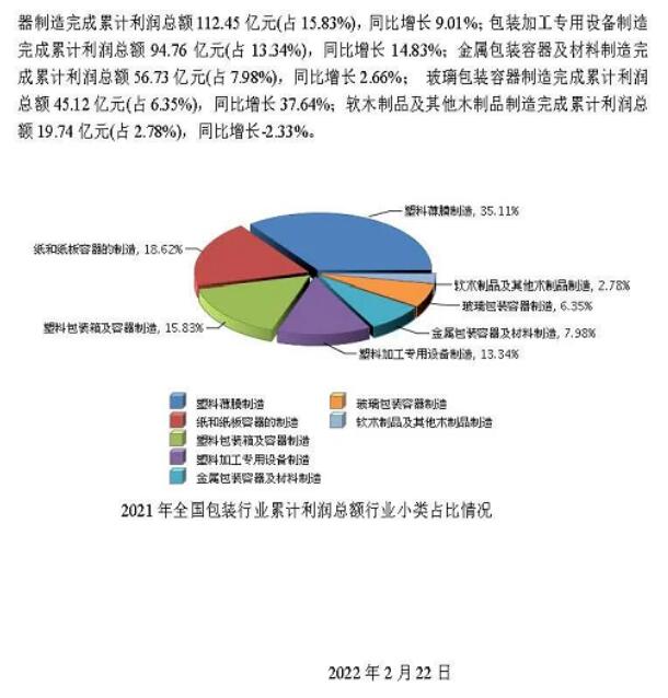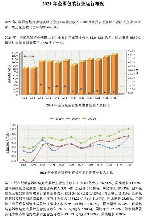 2月22日,中國包裝聯合會公布了2021年全國包裝行業運行概況。2021年,我國包裝行業規模以上企業(年營業收入2000萬元及以上全部工業法人企業)8831家,規上企業數比去年增加648家。