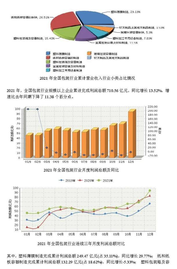 在凈利潤方面,2021年,全國包裝行業規模以上企業累計完成利潤總額710.56億元,同比增長13.52%,增速比去年同期下降了11.38個百分點。其中,紙和紙板容器制造行業完成累計利潤總額132.29億元(占18.62%),同比下滑5.33%。