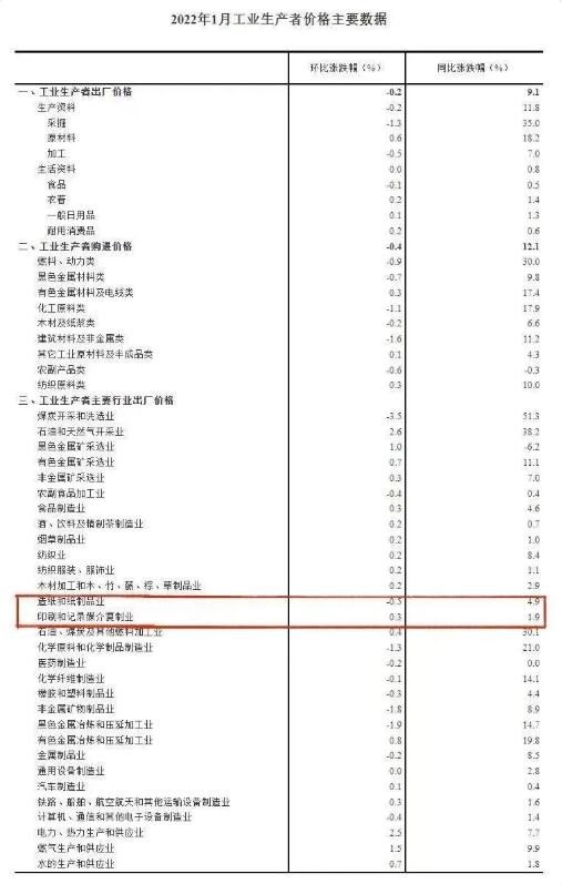 值得關注的是,造紙和紙制品業工業生產者出廠價格同比增長4.9%;印刷和記錄媒介復制業工業生產者出廠價格同比增長1.9%。