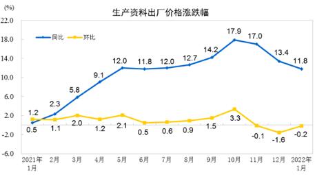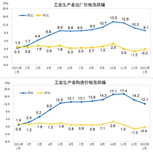 近日,國家統計局發布2022年1月份工業生產者出廠價格變動情況。2022年1月份,全國工業生產者出廠價格同比上漲9.1%,環比下降0.2%;工業生產者購進價格同比上漲12.1%,環比下降0.4%。
