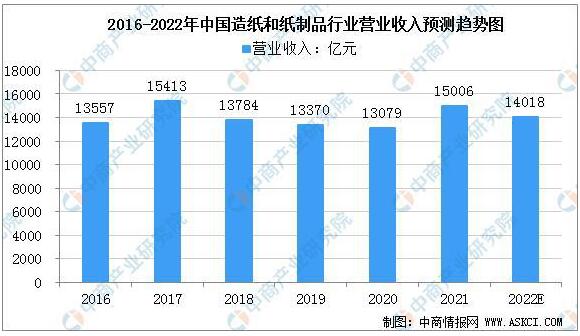 中國造紙工業(yè)經(jīng)過近30年的發(fā)展,逐步發(fā)展壯大,紙制品市場(chǎng)已從過去緊缺型變成基本平衡型,近幾年已形成產(chǎn)需基本平衡的格局,多數(shù)產(chǎn)品已基本滿足國內(nèi)市場(chǎng)需求。2021年中國造紙及紙制品行業(yè)營業(yè)收入合計(jì)為15006億元,相較上年增加1927億元,受雙碳政策影響,中商產(chǎn)業(yè)研究院預(yù)計(jì)2022年中國造紙及紙制品行業(yè)營業(yè)收入有所下滑,為14018億元。
