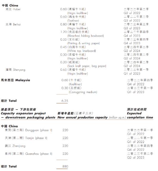 三、財務回顧 收入:于本期間,本集團的收入約為人民幣34,471.3百萬元,較去年同期增加 約11.6%。本集團收入之主要來源仍為其包裝紙業務(包括卡紙、高強瓦楞芯紙及涂布灰底白板紙),占收入約93.3%,其余約6.7%的收入則來自其文化用紙、高價特種紙及漿產品。本集團于二零二一年十二月三十一日的包裝紙板、文化用紙、高價特種紙及漿產品的設計年產能合共為約18.4百萬噸,其中卡紙、高強瓦楞芯紙、涂布灰底白板紙、文化用紙、高價特種紙及漿產品分別為約10.2百萬噸、約3.4百萬噸、 約2.6百萬噸、約1.1百萬噸及約1.1百萬 噸。四家美國漿紙廠年產能為約1.3百萬噸產品(包括用于文化用紙的單面涂布 紙、銅板紙及涂布機械漿紙以及特種紙年產能為約0.9百萬噸,及再生紙漿以及硬木木漿年產能為約0.4百萬噸)。 本集團的銷量保持相對穩定并達到約8.4百萬噸,較去年同期8.6百萬噸減少約1.6%。銷量輕微下跌乃由中國銷量減少約0.2百萬噸所帶動。本期間的卡紙及涂布灰底白板紙銷量較去年同期分別減少3.5%及4.4%而本期間的高強瓦楞芯紙銷量則增加約13.6%。本集團的收入繼續主要來自中國市場(尤其是卡紙及高強瓦楞芯紙業務)。于本期間,中國消費相關的收入占本集團總收入91.3%,而余下8.7%的收入則為對其他國家銷售錄得的收入。 于本期間,來自本集團五大客戶的收入合共占總收入約7.2%(截至二零二零年 十二月三十一日止六個月:7.4%),其中最大單一客戶的收入約占3.2%(截至二零 二 零 年 十 二 月 三 十 一 日 止 六 個 月:3.1%)。 毛利潤及毛利率:于本期間,毛利潤約為人民幣4,680.6百萬元,較去年同期的人民幣6,455.1百萬元減少約人民幣1,774.5百萬元或27.5%。毛利率則由去年同期的20.9%減少至本期間的約13.6%,乃主要由于本期間的產品售價之增加遠較原料成本之增加慢所致。銷售及市場推廣成本銷售及市場推廣成本由去年同期的人民幣921.0百萬元增加約2.9%至本期間的約人民幣947.3百萬元。 經營盈利:于本期間的經營盈利約為人民幣2,888.3百萬元,較去年同期減少約人民幣2,045.6百萬元或41.5%。經營盈利率由去年同期的16.0%減少至本期間的約8.4%,主要由于本集團的毛利率減少所致。