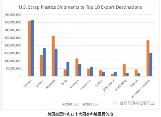 與廢紙一樣,2021年運(yùn)往不同國(guó)家的重量有大幅的波動(dòng)。接收美國(guó)廢塑料的國(guó)家包括印度(增長(zhǎng)110%)、薩爾瓦多(增長(zhǎng)77%)、墨西哥(增長(zhǎng)34%)、印度尼西亞(增長(zhǎng)27%)和加拿大(增長(zhǎng)2%)。 其他國(guó)家和地區(qū)大幅削減了從美國(guó)進(jìn)口的數(shù)量,包括中國(guó)香港(下降72%)、中國(guó)臺(tái)灣(下降56%)、馬來(lái)西亞(下降32%)、越南(下降31%)和土耳其(下降24%)。未進(jìn)入2021年前10名的所有其他國(guó)家和地區(qū)的總和下降了35%。到目前為止,加拿大仍然是廢塑料的最大進(jìn)口國(guó)。在馬來(lái)西亞新政實(shí)施后,加拿大從2019年開(kāi)始躍居第一。