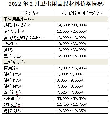 熱風非織造布價格仍在1.95萬~3萬元/t的區(qū)間,與1月基本持平;復合芯體價格約為1.25萬~2.0萬元/t,比1月上調10%左右,主要是因為各種原材料價格上漲所致;高吸收性樹脂(SAP)價格約為1.3萬~1.8萬元/t,比1月價格上漲7%~8%,主要是由于原料、能源價格上漲且丙烯酸供應緊張,導致SAP產量不足,供不應求價格上漲;熱熔膠價格約為1.3萬~2.2萬元/t,與1月基本持平;薄膜價格約為1.2萬~2.2萬元/t,與1月基本持平;塑料母粒價格約為1.2萬~1.5萬元/t,比1月上調8%左右,主要是由于國際原油價格上漲及海運費上漲等不利因素造成的。 上游原材料方面,丙烯酸價格上漲超過10%,達到1.48萬~1.59萬元/t。除40D氨綸價格下降6.4%以外,其他材料價格都有不同程度的上漲,幅度在1%~7%之間。