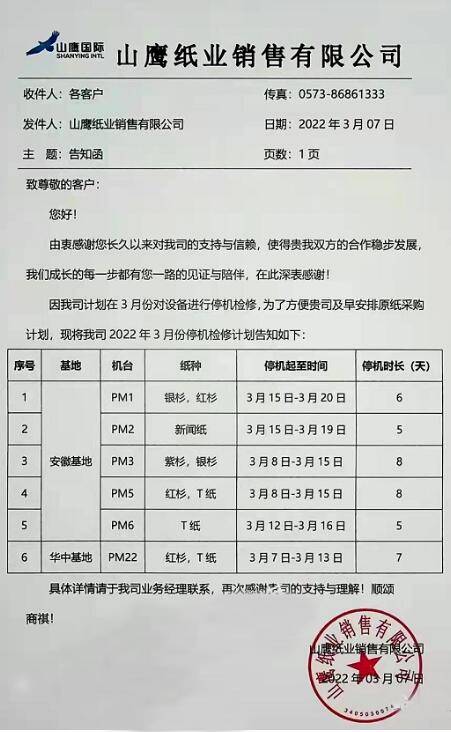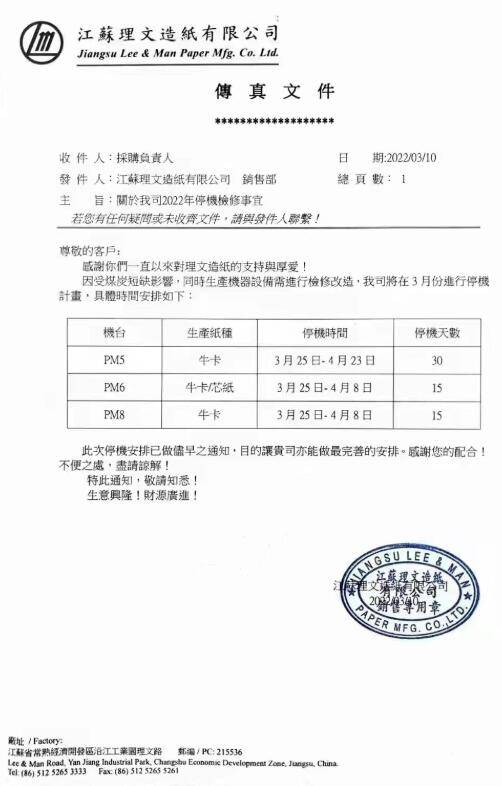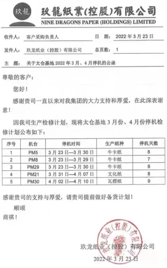 3月23日,玖龍紙業再發停機函,宣布太倉玖龍將在3月23日至4月10日期間停機檢修7-9天,受影響的紙種主要為牛卡紙、文化紙和瓦楞紙。太倉玖龍紙業是玖龍紙業旗下第二大生產基地,年設計產能超300萬噸,本次多臺紙機停機數日預計總減產4萬噸以上。 具體而言,牛卡紙紙機PM5、PM8、PM29均從3月23日開始停機,其中PM8停機7天,PM5和PM29停機8天;生產文化紙的PM21從3月31日起停機8天;PM30主要生產瓦楞紙,將在4月2日-4月10日期間停機9天。