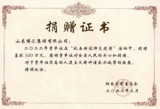 面對(duì)今年春天全國(guó)范圍內(nèi)新冠疫情卷土重來(lái)的嚴(yán)峻形勢(shì),金光集團(tuán)始終時(shí)刻關(guān)注,攜手黃奕聰慈善基金會(huì)和旗下企業(yè),心手相連眾志成城,第一時(shí)間向淄博桓臺(tái)、欽州港、吉林市、長(zhǎng)春市、上海市、泉州市等地捐贈(zèng)總價(jià)值1000萬(wàn)的資金及物資抗擊疫情,用愛(ài)驅(qū)散“寒意”,助力打贏這場(chǎng)疫情阻擊戰(zhàn)! 大愛(ài)無(wú)疆 博匯集團(tuán)捐資500萬(wàn)元助力抗疫 3月17日,面對(duì)山東淄博桓臺(tái)縣嚴(yán)峻的新冠形勢(shì),博匯集團(tuán)在金光集團(tuán)APP(中國(guó))總部的全力支持下,向山東省淄博市桓臺(tái)縣慈善總會(huì)捐款500萬(wàn)元,助力桓臺(tái)及地方抗擊防控新冠疫情,以實(shí)際行動(dòng)詮釋了愛(ài)國(guó)企業(yè)的社會(huì)責(zé)任擔(dān)當(dāng)。