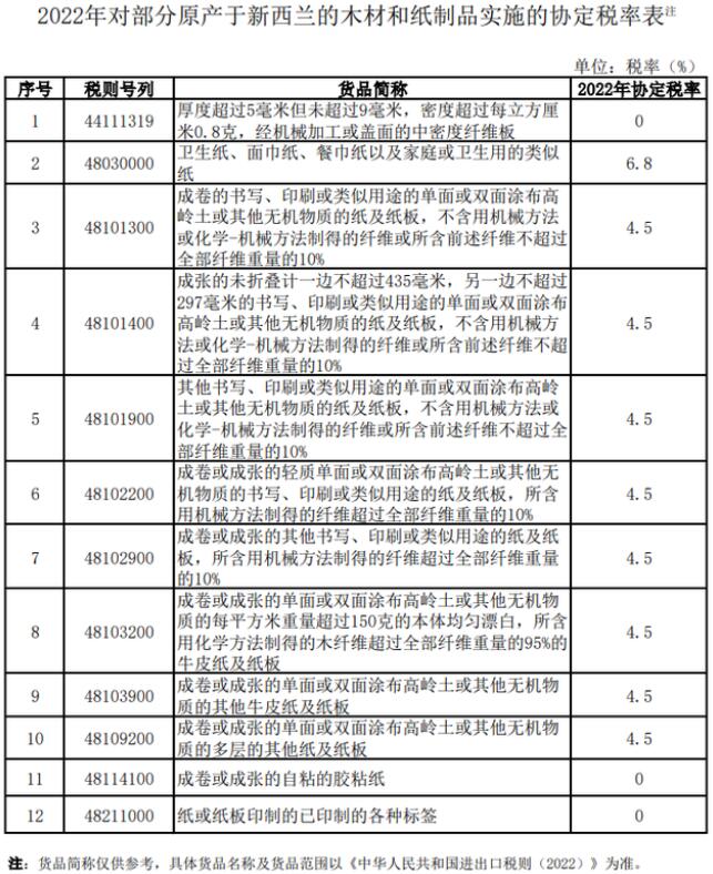 為履行《升級議定書》及相關換文規定,國務院關稅稅則委員會發布公告,自4月7日起對部分原產于新西蘭的木材和紙制品稅目實施協定稅率,后續年度稅率自當年1月1日起實施。