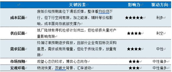 [導語] 2022年一季度瓦楞紙市場供需端多空博弈,紙價震蕩偏下運行。二季度市場不確定因素依舊較多,但成本支撐以及宏觀消費環境預期轉好,預期紙價震蕩偏上運行。 一季度瓦楞紙市場交投不溫不火,紙價震蕩偏下運行。其中高點出現在2月中旬的3934元/噸,低點出現在3月中旬3766元/噸,高低價格差在168元/噸,波幅4.27%。據卓創資訊數據監測:瓦楞紙市場一季度全國均價為3857元/噸,環比跌幅9.26%,較去年同期上漲1.60%。 一季度價格震蕩偏下運行 一季度瓦楞紙市場交投不溫不火,紙價震蕩偏下運行。據卓創資訊數據監測:2022年一季度AA級瓦楞紙120g全國均價為3857元/噸,環比下跌9.26%,同比上漲1.60%。回顧市場來看:1月市場大穩小調運行,上半月個別低端資源小幅提漲,下半月臨近春節假期,商家對市場關注度下降,紙企調價意愿減弱,僅華南市場因下游備庫,報盤小幅上調。2月市場紙價先揚后抑,春節后部分紙廠先試探上調,后因需求跟進不佳,紙價窄幅下滑。3月瓦楞紙市場紙價跌后區間震蕩,紙廠停機檢修消息頻發,現貨供應減量,一定程度上緩沖了需求寡淡帶來的庫存壓力,整體紙價先跌,后因成本上漲,紙價進入震蕩調整期,實單成交下跌50-150元/噸。 基本面運行偏弱 一季度供需端多空博弈,整體偏弱運行。從宏觀數據來看,3 月制造業PMI 為49.5%,比上月下降0.7 個百分點,由擴張轉為收縮。總體來看,生產與需求兩端同步走弱帶動整體PMI 數值重回榮枯線以下。從微觀視角來看,一季度紙廠受到多重因素影響,部分紙廠主動或被動停機檢修,導致現貨供應端收緊,紙廠產能利用率下滑,據卓創資訊數據統計,一季度瓦楞紙行業開工在57%左右;1-2月份瓦楞紙進口量在36.18萬噸,同比減少27.77%。需求端亦無明顯釋放,3 月新出口訂單指數為47.2%,較上月下降1.8個百分點,較上月進一步收縮,外部需求市場存在著較大的不確定性,因此一季度瓦楞紙行業基本面走勢偏弱。 成本是紙廠紙價最重要的因素 目前生產瓦楞原紙的企業主要原料為廢舊黃板紙、玉米淀粉,輔料為煤炭、天然氣等。據卓創資訊數據監測,原料價格走勢好于瓦楞紙價格走勢,成本變動對紙價引導作用增強,對紙價形成較強的底部支撐。從具體數據來看,國廢黃板紙方面,一季度國廢黃板紙市場價均價在2308元/噸,環比跌幅5.11%,同比上漲0.88%;玉米淀粉市場均價在3341元/噸,環比跌幅4.42%,同比跌幅8.23%。煤炭Q5500全國均價1016元/噸,環比上漲2.62%,同比漲幅60.90%;廣東地區天然氣7080元/噸,環比上漲6.77%,同比68.75%。從瓦楞紙一季度盈利情況來看,行業平均盈利水平在13.52%,環比下降0.64%,整體看能源成本偏強運行,對紙價形成較強底部支撐。 表 二季度瓦楞紙影響因素評價表