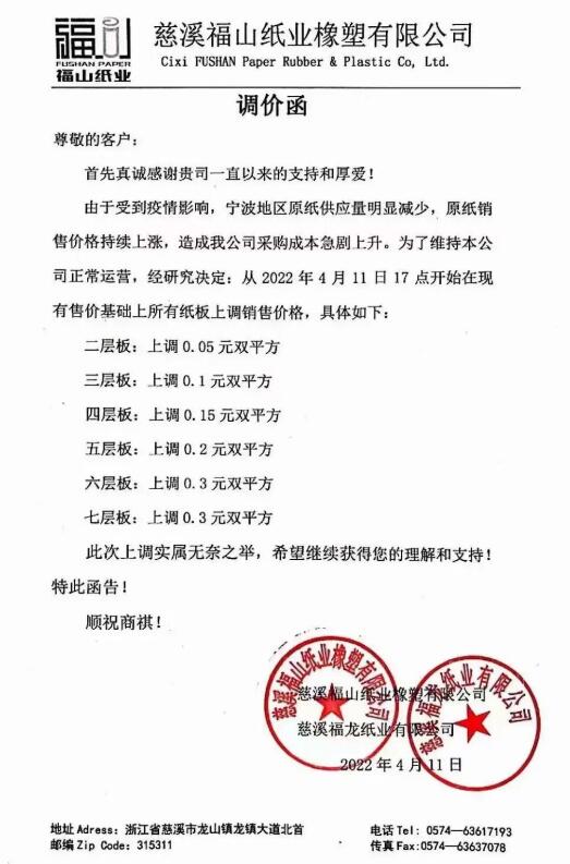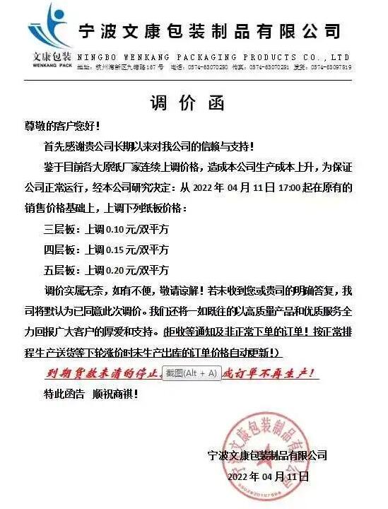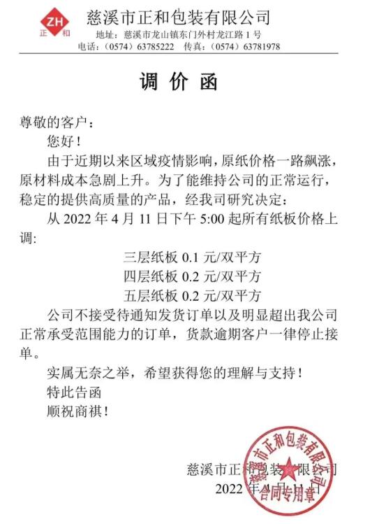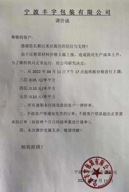 受到疫情的影響,從3月開始,多地快遞物流出現了階段性延緩甚至中斷,F在對于紙箱行業人士來說,除了擔心水漲船高的成本,還要憂愁物流能不能送到的難題。有多家紙箱廠反映,平時2-4天就能到的材料,現在至少要5-7天,極端點的甚至要10幾天。 在交貨壓力下,從3月底開始上海及周邊部分紙板、紙箱訂單以高出地區平均水平的價格外流,并造成紙板價格異常上漲。以臨近上海的蘇州某紙板廠為例,其紙板價格自疫情來已經漲了將近20%。 而隨著受物流受阻及停工影響的地區增多,從上周起,該工廠也被迫停工,訂單再度往更遠的周邊地區流出,帶來的交貨周期延長和價格上漲,讓本就缺料的下游雪上加霜。此外,由于疫情因素,原紙供應減少,導致原紙漲價,也在推動紙板價格上漲。下圖為已發布的漲價函: 寧波豐宇包裝: