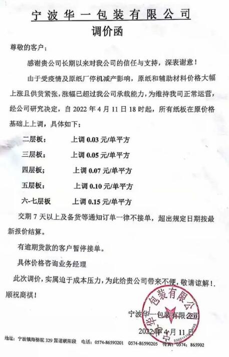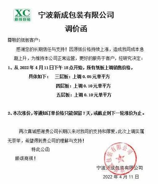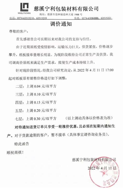 慈溪寧利包裝:4月11日17點起,對紙板價格進行調整,二層、三層、四層、五層、七層紙板價格按原基礎上調0.04元/雙平方、0.10元/雙平方、0.15元/雙平方、0.20元/雙平方、0.30元/雙平方;