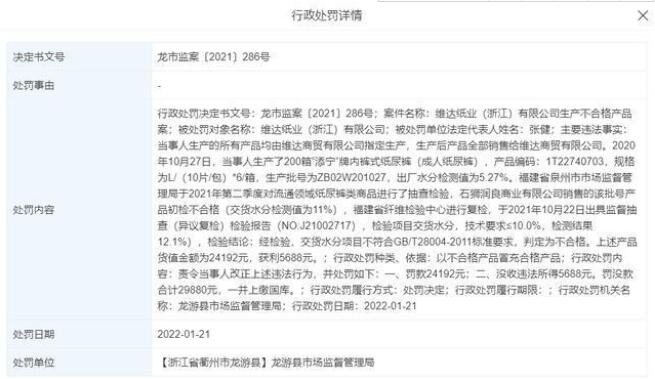 近日,中國經濟網記者在天眼查發現,維達紙業(浙江)有限公司因生產的紙尿褲交貨水分項目初檢復檢均不合格,被龍游縣市場監督管理局罰款2.42萬元、沒收違法所得5688元。