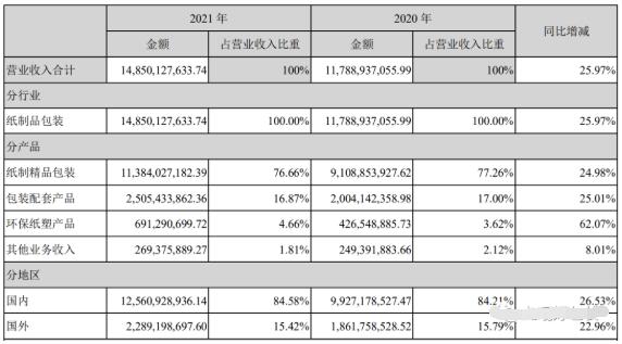 裕同科技于2016年登陸深交所,隨后幾年積極進取,在鞏固既有優勢的消費電子包裝之外,快速布局煙包、酒包、紙漿模塑業務,實現快速發展。在年報的營收構成中,裕同科技將旗下產品分為四大類,分別是紙質精品包裝、包裝配套產品、環保紙塑產品以及其他業務。