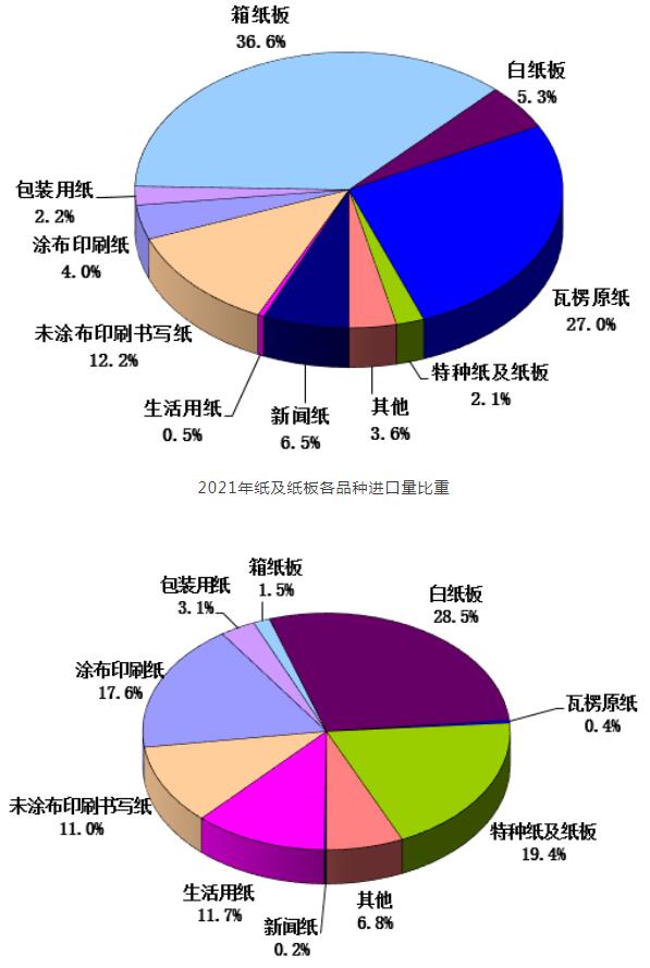 2021年紙及紙板各品種出口量比重 。ㄋ模┘埣凹埌逯饕a(chǎn)品2012~2021年進(jìn)出口情況 1、新聞紙:2021年進(jìn)口量大于出口量,凈進(jìn)口量70萬(wàn)噸。 2、未涂布印刷書(shū)寫(xiě)紙:2021年進(jìn)口量大于出口量,凈進(jìn)口量73萬(wàn)噸。 3、涂布印刷紙:2021年進(jìn)口量小于出口量,凈出口量52萬(wàn)噸。 其中:銅版紙:2021年進(jìn)口量小于出口量,凈出口量26萬(wàn)噸。 4、生活用紙:2021年進(jìn)口量小于出口量,凈出口量59萬(wàn)噸。 5、包裝用紙:2021年進(jìn)口量大于出口量,凈進(jìn)口量7萬(wàn)噸。 6、白紙板:2021年進(jìn)口量小于出口量,凈出口量98萬(wàn)噸。 其中:涂布白紙板:2021年進(jìn)口量小于出口量,凈出口量99萬(wàn)噸。 7、箱紙板:2021年進(jìn)口量大于出口量,凈進(jìn)口量391萬(wàn)噸。 8、瓦楞原紙:2021年進(jìn)口量大于出口量,凈進(jìn)口量292萬(wàn)噸。 9、特種紙及紙板:2021年進(jìn)口量小于出口量,凈出口量83萬(wàn)噸。 。ㄎ澹┘堉破愤M(jìn)出口情況 1、2021年紙制品進(jìn)口量19萬(wàn)噸,較上年增加3萬(wàn)噸,同比增長(zhǎng)18.75%。 2、2021年紙制品出口量375萬(wàn)噸,較上年增加51萬(wàn)噸,同比增長(zhǎng)15.74%。 六、紙及紙板生產(chǎn)布局與集中度 根據(jù)中國(guó)造紙協(xié)會(huì)調(diào)查資料,2021年我國(guó)東部地區(qū)11個(gè)。▍^(qū)、市),紙及紙板產(chǎn)量占全國(guó)紙及紙板產(chǎn)量比例為69.6%;中部地區(qū)8個(gè)。▍^(qū))比例占18.5%;西部地區(qū)12個(gè)省(區(qū)、市)比例占11.9%。 2021年山東省、廣東省、江蘇省、浙江省、福建省、河南省、湖北省、重慶市、河北省、四川省、廣西壯族自治區(qū)、安徽省、天津市、江西省、湖南省、遼寧省和海南省17個(gè)。▍^(qū)、市)紙及紙板產(chǎn)量超過(guò)100萬(wàn)噸,產(chǎn)量合計(jì)11606萬(wàn)噸,占全國(guó)紙及紙板總產(chǎn)量的95.88%。 結(jié)語(yǔ) 2021年在國(guó)內(nèi)經(jīng)濟(jì)形勢(shì)整體穩(wěn)中向好及外貿(mào)增加的帶動(dòng)下,造紙行業(yè)克服了原料、能源、運(yùn)輸?shù)瘸杀旧蠞q,新冠疫情多點(diǎn)散發(fā)對(duì)市場(chǎng)帶來(lái)諸多不確定因素等影響,通過(guò)優(yōu)化產(chǎn)業(yè)結(jié)構(gòu),提升產(chǎn)品質(zhì)量,適應(yīng)市場(chǎng)需求變化,加快綠色發(fā)展步伐,保障了市場(chǎng)供給,實(shí)現(xiàn)了產(chǎn)銷(xiāo)兩旺,經(jīng)濟(jì)效益顯著增長(zhǎng),保持了造紙行業(yè)平穩(wěn)發(fā)展。