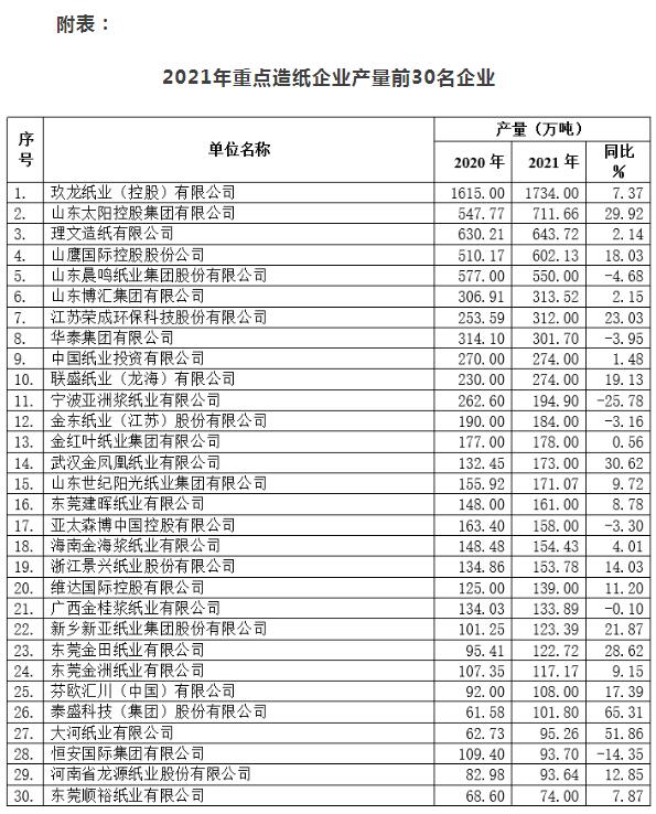 據(jù)中國(guó)造紙協(xié)會(huì)統(tǒng)計(jì),制漿造紙及紙制品全行業(yè)2021年完成紙漿、紙及紙板和紙制品合計(jì)28021萬(wàn)噸,同比增長(zhǎng)9.89%;其中:紙及紙板產(chǎn)量12105萬(wàn)噸,較上年增長(zhǎng)7.50%;紙漿產(chǎn)量8177萬(wàn)噸,較上年增長(zhǎng)10.83%;紙制品產(chǎn)量7739萬(wàn)噸,較上年增長(zhǎng)12.81%;全行業(yè)營(yíng)業(yè)收入完成1.50萬(wàn)億元,同比增長(zhǎng)14.74%;實(shí)現(xiàn)利潤(rùn)總額885億元,同比增長(zhǎng)6.92%。 一、紙及紙板生產(chǎn)和消費(fèi)情況 。ㄒ唬┘埣凹埌迳a(chǎn)量和消費(fèi)量 據(jù)中國(guó)造紙協(xié)會(huì)調(diào)查資料,2021年全國(guó)紙及紙板生產(chǎn)企業(yè)約2500家,全國(guó)紙及紙板生產(chǎn)量12105萬(wàn)噸,較上年增長(zhǎng)7.50%。消費(fèi)量12648萬(wàn)噸,較上年增長(zhǎng)6.94%,人均年消費(fèi)量為89.51千克(14.13億人)。2012~2021年,紙及紙板生產(chǎn)量年均增長(zhǎng)率1.87%,消費(fèi)量年均增長(zhǎng)率2.59%。 (二)紙及紙板主要產(chǎn)品生產(chǎn)和消費(fèi)情況 1、新聞紙 2021年新聞紙生產(chǎn)量90萬(wàn)噸,較上年增長(zhǎng)-18.18%;消費(fèi)量160萬(wàn)噸,較上年增長(zhǎng)-8.57%。2012~2021年生產(chǎn)量年均增長(zhǎng)率-14.79%,消費(fèi)量年均增長(zhǎng)率-9.50%。 2、未涂布印刷書(shū)寫(xiě)紙 2021年未涂布印刷書(shū)寫(xiě)紙生產(chǎn)量1720萬(wàn)噸,較上年增長(zhǎng)-0.58%;消費(fèi)量1793萬(wàn)噸,較上年增長(zhǎng)0.56%。2012~2021年生產(chǎn)量年均增長(zhǎng)率-0.19%,消費(fèi)量年均增長(zhǎng)率0.70%。 3、涂布印刷紙 2021年涂布印刷紙生產(chǎn)量635萬(wàn)噸,較上年增長(zhǎng)-0.78%;消費(fèi)量583萬(wàn)噸,較上年增長(zhǎng)2.10%。2012~2021年生產(chǎn)量年均增長(zhǎng)率-2.26%,消費(fèi)量年均增長(zhǎng)率-1.00%。 其中:銅版紙 2021年銅版紙生產(chǎn)量605萬(wàn)噸,較上年增長(zhǎng)0.83%;消費(fèi)量579萬(wàn)噸,較上年增長(zhǎng)4.14%。2012~2021年生產(chǎn)量年均增長(zhǎng)率-1.53%,消費(fèi)量年均增長(zhǎng)率-0.04%。 4、生活用紙 2021年生活用紙生產(chǎn)量1105萬(wàn)噸,較上年增長(zhǎng)2.31%;消費(fèi)量1046萬(wàn)噸,較上年增長(zhǎng)5.02%。2012~2021年生產(chǎn)量年均增長(zhǎng)率3.95%,消費(fèi)量年均增長(zhǎng)率4.06%。 5、包裝用紙 2021年包裝用紙生產(chǎn)量715萬(wàn)噸,較上年增長(zhǎng)1.42%;消費(fèi)量722萬(wàn)噸,較上年增長(zhǎng)0.56%。2012~2021年生產(chǎn)量年均增長(zhǎng)率1.24%,消費(fèi)量年均增長(zhǎng)率1.09%。 6、白紙板 2021年白紙板生產(chǎn)量1525萬(wàn)噸,較上年增長(zhǎng)2.35%;消費(fèi)量1427萬(wàn)噸,較上年增長(zhǎng)3.93%。2012~2021年生產(chǎn)量年均增長(zhǎng)率1.04%,消費(fèi)量年均增長(zhǎng)率0.38%。 其中:涂布白紙板 2021年涂布白紙板生產(chǎn)量1445萬(wàn)噸,較上年增長(zhǎng)2.48%;消費(fèi)量1346萬(wàn)噸,較上年增長(zhǎng)4.18%。2012~2021年生產(chǎn)量年均增長(zhǎng)率0.84%,消費(fèi)量年均增長(zhǎng)率0.14%。 7、箱紙板 2021年箱紙板生產(chǎn)量2805萬(wàn)噸,較上年增長(zhǎng)14.96%;消費(fèi)量3196萬(wàn)噸,較上年增長(zhǎng)12.65%。2012~2021年生產(chǎn)量年均增長(zhǎng)率3.38%,消費(fèi)量年均增長(zhǎng)率4.47%。 8、瓦楞原紙 2021年瓦楞原紙生產(chǎn)量2685萬(wàn)噸,較上年增長(zhǎng)12.34%;消費(fèi)量2977萬(wàn)噸,較上年增長(zhǎng)7.24%。2012~2021年生產(chǎn)量年均增長(zhǎng)率3.21%,消費(fèi)量年均增長(zhǎng)率4.36%。 9、特種紙及紙板 2021年特種紙及紙板生產(chǎn)量395萬(wàn)噸,較上年增長(zhǎng)-2.47%;消費(fèi)量312萬(wàn)噸,較上年增長(zhǎng)-5.45%。2012~2021年生產(chǎn)量年均增長(zhǎng)率6.72%,消費(fèi)量年均增長(zhǎng)率6.11%。 二、紙及紙板生產(chǎn)企業(yè)經(jīng)濟(jì)指標(biāo)完成情況 據(jù)統(tǒng)計(jì)2426家造紙生產(chǎn)企業(yè),2021年1~12月?tīng)I(yíng)業(yè)收入8551億元;工業(yè)增加值增速8.00%;產(chǎn)成品存貨418億元,同比增長(zhǎng)33.33%;利潤(rùn)總額541億元,同比增長(zhǎng)17.01%;資產(chǎn)總計(jì)10748億元,同比增長(zhǎng)5.37%;資產(chǎn)負(fù)債率58.88%;負(fù)債總額6328億元,同比增長(zhǎng)5.59%;在統(tǒng)計(jì)的2426家造紙生產(chǎn)企業(yè)中,虧損企業(yè)有452家,占18.63%。 三、紙漿生產(chǎn)和消耗情況 。ㄒ唬2021年紙漿生產(chǎn)情況 據(jù)中國(guó)造紙協(xié)會(huì)調(diào)查資料,2021年全國(guó)紙漿生產(chǎn)總量8177萬(wàn)噸,較上年增長(zhǎng)10.83%。其中:木漿1809萬(wàn)噸,較上年增長(zhǎng)21.41%;廢紙漿5814萬(wàn)噸,較上年增長(zhǎng)8.41%;非木漿554萬(wàn)噸,較上年增長(zhǎng)5.52%。 (二)2021年紙漿消耗情況 2021年全國(guó)紙漿消耗總量11010萬(wàn)噸,較上年增長(zhǎng)7.94%。木漿4151萬(wàn)噸,占紙漿消耗總量38%,其中進(jìn)口木漿占22%、國(guó)產(chǎn)木漿占16%;廢紙漿6311萬(wàn)噸,占紙漿消耗總量57%,其中:進(jìn)口廢紙漿占3%、用國(guó)內(nèi)廢紙制漿占54%;非木漿548萬(wàn)噸,占紙漿消耗總量5%。 (三)2021年廢紙利用情況 2021年利用國(guó)內(nèi)回收廢紙總量6491萬(wàn)噸,較上年增長(zhǎng)18.17%,廢紙回收率51.3%,廢紙利用率54.1%,2012~2021年國(guó)內(nèi)廢紙回收量年均增長(zhǎng)率4.22%。 四、紙制品生產(chǎn)和消費(fèi)情況 據(jù)統(tǒng)計(jì),2021年全國(guó)規(guī)模以上紙制品生產(chǎn)企