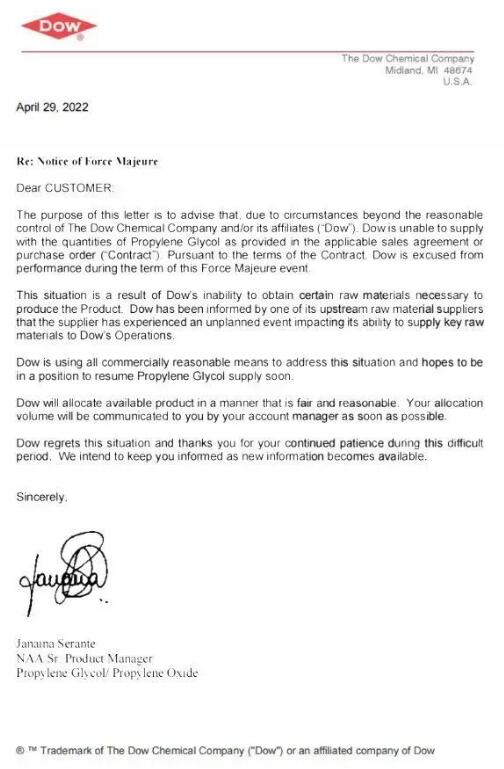 全球能源危機影響下,陶氏近日宣布受供應商意外事故影響,丙二醇遭遇不可抗力而停供,由此引發巴斯夫、三井化學、揚子石化等多家紙尿褲原料供應商的連鎖斷供危機。 近日,陶氏發布緊急通知稱,受上游原材料的一家供應商意外事故影響,中斷了其向陶氏業務供應關鍵原材料的能力,因此,陶氏宣布丙二醇遭遇不可抗力而停供,恢復時間后續通知。