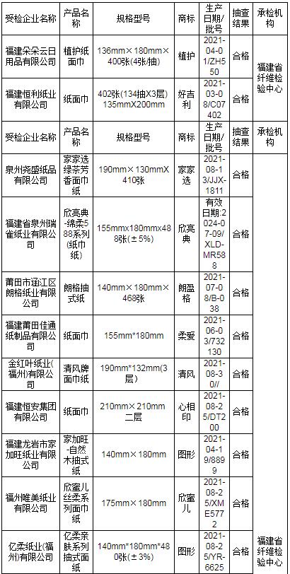 近期,依據《中華人民共和國產品質量法》,福建省市場監督管理局組織對紙巾紙產品質量開展省級監督抽查。本次共抽查30家生產企業生產的30批次產品,其中1批次不合格,不合格發現率為3.3%。 本次抽查依據GB 15979-2002 《一次性使用衛生用品衛生標準》、GB/T 20808-2011 《紙巾紙》、QB/T 4509-2013 《本色生活用紙》等標準要求,對細菌菌落總數、大腸菌群、綠膿桿菌、金黃色葡萄球菌、溶血性鏈球菌、真菌菌落總數、亮度(白度)、可遷移性熒光增白劑、灰分、橫向吸液高度、橫向抗張指數、縱向濕抗張強度、柔軟度等13個項目進行檢驗。其中發現不合格項目為縱向濕抗張強度。 省市場監管局已責成市市場監管局對本次抽查不合格產品及其生產企業依法予以處理。 表1 福建省紙巾紙產品質量省級監督抽查結果(合格)