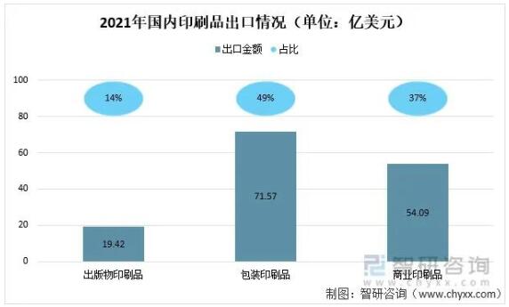資料來源:國家海關總署、智研咨詢整理 2021年國內印刷品出口145.08億美元。其中,出版物印刷品出口19.42億美元、包裝印刷品出口71.57億美元、商業印刷品出口54.09億美元。出版物印刷品、包裝印刷品和商業印刷品出口占國內印刷品出口總金額的比重分別為14%、49%和37%。 2021年國內印刷品出口情況(單位:億美元)