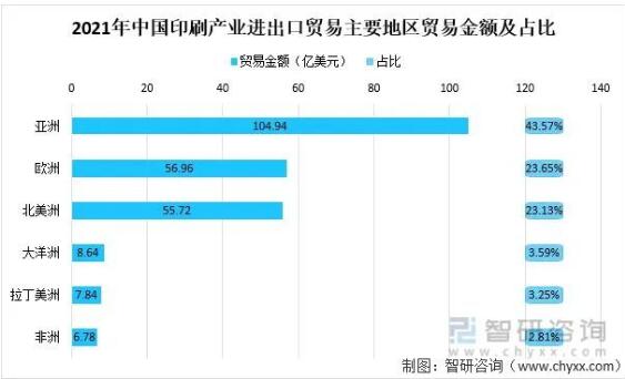 資料來源:國家新聞出版署、智研咨詢整理 二、進出口情況 2021年國內印刷產業進出口涉及全球五大洲230個國家/地區,其貿易額在全球各大洲的分布為,亞洲104.94億美元、歐洲56.96億美元、北美洲55.72億美元、大洋洲8.64億美元、拉丁美洲7.84億美元、非洲6.78億美元。 2021年中國印刷產業進出口貿易主要地區貿易金額及占比