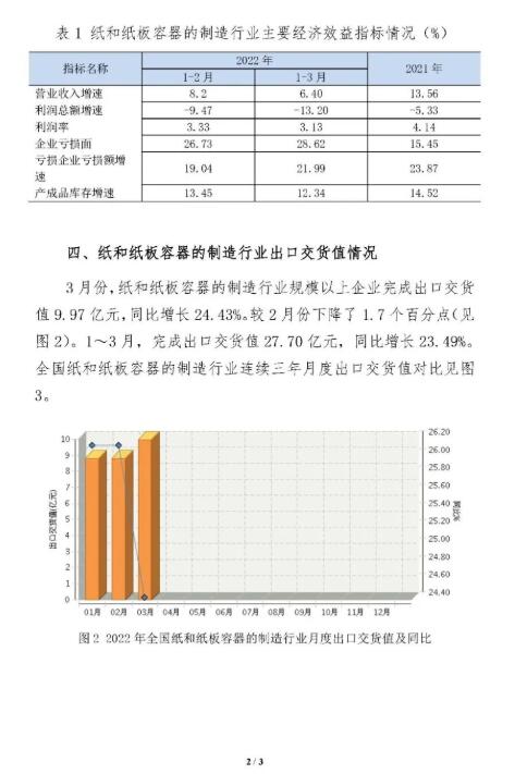 日前,中國包裝聯合會公布了《2022年一季度紙和紙板容器行業經濟運行簡報》。2022年1-3月,全國紙和紙板容器制造行業累計完成營業收入778.65億元,同比增長6.40%。