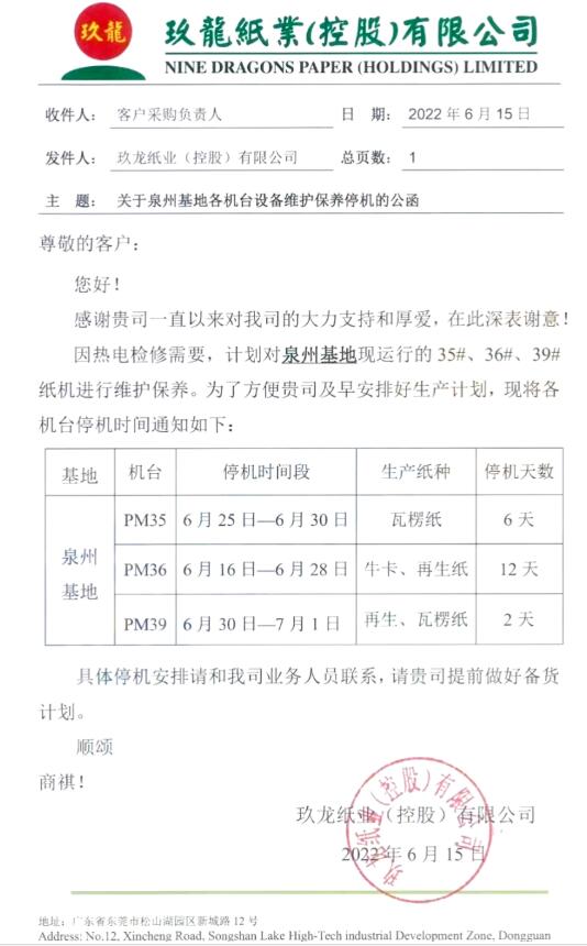 6月15日,玖龍紙業(yè)發(fā)布停機(jī)函稱,由于熱電檢修需要,計(jì)劃對(duì)泉州玖龍的PM35、PM36、PM39三臺(tái)紙機(jī)進(jìn)行維護(hù)保養(yǎng)。本次停機(jī)覆蓋了泉州玖龍目前所有紙機(jī),停機(jī)時(shí)長(zhǎng)為2-12天。