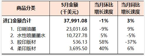 印刷器材 2022年5月國內印刷器材進口3799.11萬美元(參見表6),環比下降1%、同比增長3%。其中,印刷油墨進口2303.17萬美元(環比下降9%、同比增長9%)、水性噴墨墨水進口1072.78萬美元(環比增長5%、同比下降5%)、膠印版材進口53.61萬美元(環比增長58%、同比下降37%)、柔印版材369.55萬美元(環比增長40%、同比增長6%)。 表6 2022年5月國內印刷器材進口統計