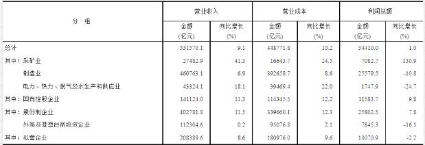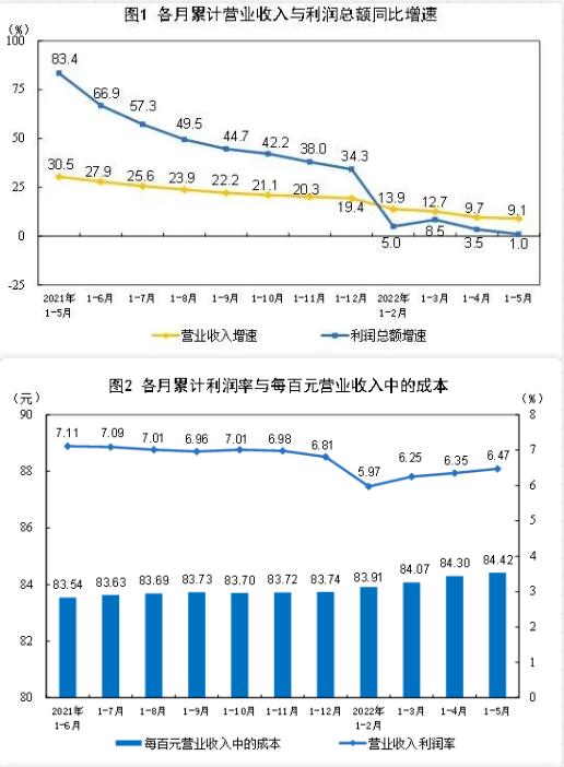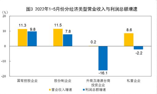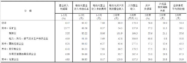 表3 2022年1-5月份規(guī)模以上工業(yè)企業(yè)主要財務(wù)指標(biāo)(分行業(yè)) 解讀: 工業(yè)企業(yè)利潤數(shù)據(jù) 5月份,在以習(xí)近平同志為核心的黨中央堅強(qiáng)領(lǐng)導(dǎo)下,各地區(qū)各部門高效統(tǒng)籌疫情防控和經(jīng)濟(jì)社會發(fā)展,國內(nèi)疫情防控形勢總體逐漸向好,企業(yè)復(fù)工復(fù)產(chǎn)、物流保通保暢有序推進(jìn),工業(yè)企業(yè)生產(chǎn)經(jīng)營逐步恢復(fù),企業(yè)利潤降幅收窄。 主要特點如下: 一是工業(yè)企業(yè)營收有所回升。受生產(chǎn)物流逐步恢復(fù)、產(chǎn)業(yè)鏈供應(yīng)鏈逐步暢通推動,工業(yè)企業(yè)銷售狀況有所改善。 二是企業(yè)單位費(fèi)用下降。5月份,減稅降費(fèi)、助企紓困政策效應(yīng)持續(xù)釋放,工業(yè)企業(yè)費(fèi)用負(fù)擔(dān)繼續(xù)減輕。 三是工業(yè)企業(yè)利潤降幅收窄。5月份,全國規(guī)模以上工業(yè)企業(yè)利潤同比下降6.5%,降幅較上月收窄2.0個百分點。1—5月份,規(guī)模以上工業(yè)企業(yè)利潤同比增長1.0%。 四是長三角、東北地區(qū)工業(yè)企業(yè)利潤降幅明顯收窄。5月份,隨著企業(yè)復(fù)工復(fù)產(chǎn)持續(xù)推進(jìn),長三角和東北地區(qū)工業(yè)企業(yè)利潤雖同比下降,但降幅較上月明顯收窄 五是煤炭、石油等能源行業(yè)利潤仍保持成倍增長。這兩個行業(yè)合計拉動規(guī)模以上工業(yè)企業(yè)利潤增長9.5個百分點。 六是裝備制造業(yè)利潤邊際改善明顯。隨著裝備制造重點地區(qū)企業(yè)復(fù)工復(fù)產(chǎn)有序推進(jìn),物流堵點卡點有效暢通,裝備制造業(yè)效益狀況明顯好轉(zhuǎn)。 七是基本消費(fèi)品行業(yè)盈利繼續(xù)恢復(fù)。隨著市場需求逐步恢復(fù),加之?dāng)U內(nèi)需、促消費(fèi)政策效應(yīng)持續(xù)釋放,基本消費(fèi)品行業(yè)盈利繼續(xù)恢復(fù)。 總體看,工業(yè)企業(yè)效益狀況雖出現(xiàn)一些積極變化,但也要看到,5月份工業(yè)企業(yè)利潤同比仍繼續(xù)下降,企業(yè)成本上升壓力依然較大,生產(chǎn)經(jīng)營仍面臨諸多困難,工業(yè)企業(yè)效益恢復(fù)的基礎(chǔ)尚不牢固。當(dāng)前國際形勢更趨復(fù)雜嚴(yán)峻,工業(yè)企業(yè)效益恢復(fù)仍存在較多不確定性。 下階段,要堅決貫徹落實黨中央、國務(wù)院決策部署,高效統(tǒng)籌疫情防控和經(jīng)濟(jì)社會發(fā)展,落實落細(xì)穩(wěn)定工業(yè)經(jīng)濟(jì)一攬子政策措施,助力企業(yè)紓困解難,推動工業(yè)經(jīng)濟(jì)持續(xù)穩(wěn)定恢復(fù)。