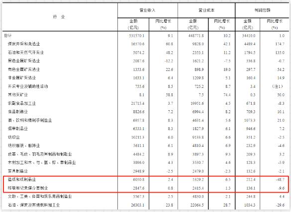 6月27日,國家統(tǒng)計局網(wǎng)站發(fā)布2022年1—5月份全國規(guī)模以上工業(yè)企業(yè)利潤。同期,國家統(tǒng)計局工業(yè)司高級統(tǒng)計師朱虹就1-5月份工業(yè)企業(yè)利潤數(shù)據(jù)進(jìn)行了解讀。 數(shù)據(jù)顯示,1—5月份,全國規(guī)模以上工業(yè)企業(yè)實現(xiàn)利潤總額3.44萬億元,同比增長1.0%。 1—5月份,規(guī)模以上工業(yè)企業(yè)中,國有控股企業(yè)實現(xiàn)利潤總額1.16萬億元,同比增長9.8%;股份制企業(yè)實現(xiàn)利潤總額2.58萬億元,增長7.8%;外商及港澳臺商投資企業(yè)實現(xiàn)利潤總額7845.3億元,下降16.1%;私營企業(yè)實現(xiàn)利潤總額1.0萬億元,下降2.2%。 1—5月份,在41個工業(yè)大類行業(yè)中,16個行業(yè)利潤總額同比增長,24個行業(yè)下降,1個行業(yè)由虧轉(zhuǎn)盈。 值得關(guān)注的是,造紙和紙制品業(yè)實現(xiàn)營業(yè)收入6050.8億元,同比增長2.4%;利潤總額212.4億元,同比下降48.7%。印刷和記錄媒介復(fù)制業(yè)實現(xiàn)營業(yè)收入2847.6億元,同比增長0.8%;利潤總額136.1億元,同比下降9.6%。 1—5月份,規(guī)模以上工業(yè)企業(yè)實現(xiàn)營業(yè)收入53.16萬億元,同比增長9.1%;發(fā)生營業(yè)成本44.88萬億元,增長10.2%;營業(yè)收入利潤率為6.47%,同比下降0.52個百分點。 5月末,規(guī)模以上工業(yè)企業(yè)資產(chǎn)總計147.62萬億元,同比增長10.4%;負(fù)債合計83.57萬億元,增長10.5%;所有者權(quán)益合計64.05萬億元,增長10.2%;資產(chǎn)負(fù)債率為56.6%,同比持平。 5月末,規(guī)模以上工業(yè)企業(yè)應(yīng)收賬款19.75萬億元,同比增長11.8%;產(chǎn)成品存貨5.96萬億元,增長19.7%。 1—5月份,規(guī)模以上工業(yè)企業(yè)每百元營業(yè)收入中的成本為84.42元,同比增加0.83元;每百元營業(yè)收入中的費(fèi)用為7.88元,同比減少0.52元。 5月末,規(guī)模以上工業(yè)企業(yè)每百元資產(chǎn)實現(xiàn)的營業(yè)收入為88.0元,同比減少1.1元;人均營業(yè)收入為170.4萬元,同比增加14.3萬元;產(chǎn)成品存貨周轉(zhuǎn)天數(shù)為19.0天,同比增加1.3天;應(yīng)收賬款平均回收期為54.4天,同比增加2.0天。