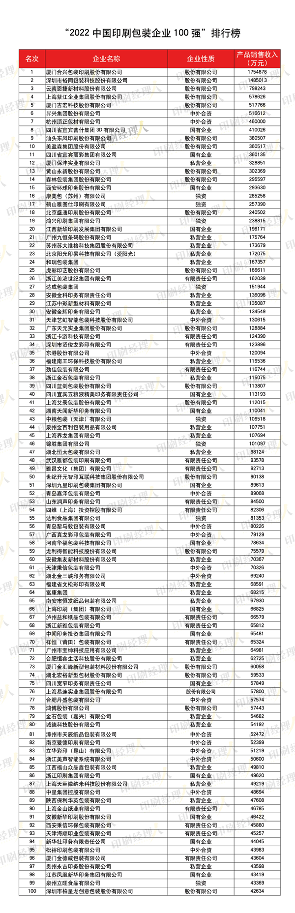 具體來(lái)看,合興包裝、裕同科技分別以175.49億元和148.50億元的年收入高居百?gòu)?qiáng)榜的前兩位。吉宏股份收入達(dá)51.78億元,但有30.38億元來(lái)源于互聯(lián)網(wǎng)業(yè)務(wù),屬于包裝業(yè)務(wù)的收入不到21億元。 在榜單之外,也有部分紙包裝企業(yè)年收入超過(guò)50億元或接近50億元。但由于各種原因,這些企業(yè)并未參選,而成為榜單的“漏網(wǎng)之魚”,比如旺盈集團(tuán),勁嘉股份,當(dāng)納利中國(guó),秉信包裝,山鷹、玖龍旗下的包裝板塊等。 山鷹國(guó)際:包裝收入70億+ 在2021年年度報(bào)告中,山鷹國(guó)際披露:公司實(shí)現(xiàn)銷售收入330.33 億元,同比增長(zhǎng)32.29%。其中,來(lái)源于造紙行業(yè)的銷售收入為210.21億元,來(lái)源于包裝板塊的銷售收入近73億元。瓦楞紙板紙箱紙箱產(chǎn)量19.88億平方米,銷量20.24億平方米,產(chǎn)銷率101.83%。 目前,山鷹國(guó)際包裝板塊的企業(yè)布局于沿江沿海經(jīng)濟(jì)發(fā)達(dá)地區(qū),貼近行業(yè)頭部客戶聚集地,產(chǎn)業(yè)輻射江蘇、浙江、安徽、福建、廣東、湖北、山東、四川、天津等省市,年產(chǎn)量在國(guó)內(nèi)位于前列。 玖龍紙業(yè):包裝業(yè)務(wù)收入極高 在2021/2022財(cái)報(bào)中,玖龍紙業(yè)沒(méi)有披露包裝業(yè)務(wù)的具體年產(chǎn)值,而是披露了包裝產(chǎn)能。截至2021年12月31日止,玖龍紙業(yè)下游包裝廠總設(shè)計(jì)年產(chǎn)能約20億平方米,其包裝基地分別位于東莞麻涌、東莞樟木頭、太倉(cāng)、天津、成都、重慶、泉州等地。 從設(shè)計(jì)年產(chǎn)能推算,玖龍紙業(yè)包裝業(yè)務(wù)的年收入大概率在50億元以上,甚至達(dá)到60多億元。此外,玖龍紙業(yè)在財(cái)報(bào)中還明確表示,集團(tuán)計(jì)劃再新增8.8億平方米下游包裝產(chǎn)能。這也意味著,隨著規(guī)模的擴(kuò)張,玖龍紙業(yè)在包裝行業(yè)的年收入還將大幅提升。 旺盈集團(tuán):年收入或55億+ 盡管旺盈集團(tuán)十分低調(diào),但卻依舊被業(yè)內(nèi)人士高度關(guān)注。因?yàn)樵撈髽I(yè)體量巨大,產(chǎn)品包括精品盒、彩盒、瓦楞紙箱、說(shuō)明書、不干膠、紙漿模塑等等,業(yè)務(wù)范圍涵蓋消費(fèi)類電子、日化、出版、玩具、零售、金融、服務(wù)等各類行業(yè)。 根據(jù)旺盈集團(tuán)官網(wǎng)介紹,該企業(yè)成立于1996年,目前員工規(guī)模超過(guò)10000人。集團(tuán)總部位于中國(guó)東莞,旗下共設(shè)有五家生產(chǎn)事業(yè)處,且在美國(guó)舊金山、香港、深圳、越南等城市均設(shè)有全資子公司。目前,集團(tuán)已實(shí)現(xiàn)跨越式發(fā)展,年度總營(yíng)業(yè)額逾50億人民幣。而據(jù)有關(guān)人士透露,旺盈集團(tuán)實(shí)際年?duì)I業(yè)額可能已經(jīng)超過(guò)了55億元。 勁嘉股份:年收入50億+ 勁嘉股份是一家上市企業(yè),其財(cái)務(wù)數(shù)據(jù)可通過(guò)財(cái)報(bào)查詢。據(jù)勁嘉股份2021年年度報(bào)告顯示,該公司目前擁有煙標(biāo)、新型煙草、彩盒、包裝新材料四大業(yè)務(wù),2021年共實(shí)現(xiàn)營(yíng)業(yè)收入50.67億元。以此數(shù)據(jù)推算,該企業(yè)若參與評(píng)選,可位列百?gòu)?qiáng)榜前七名。 據(jù)了解,勁嘉股份全名為“深圳勁嘉集團(tuán)股份有限公司”,成立于1996年10月,1997年正式投產(chǎn),2007年A股中小企業(yè)板上市。目前,擁有下屬公司30多家,在華南、華東、華中、西南、東北地區(qū)均設(shè)有生產(chǎn)基地。 當(dāng)納利中國(guó):年收入可能50億+ 毫無(wú)疑問(wèn),當(dāng)納利是全球印刷包裝巨頭。這家企業(yè)已擁有近160年歷史,總部位于芝加哥,在北美、亞洲、拉丁美洲以及歐洲共設(shè)有幾百家分支機(jī)構(gòu),2021財(cái)年?duì)I業(yè)收入近50億美元。不過(guò)在今年年初,當(dāng)納利已成為由Chatha公司控股的一家私人公司。 Chatham公司在致當(dāng)納利董事會(huì)的公開信中,明確提出要重新評(píng)估當(dāng)納利的海外業(yè)務(wù),尤其是在中國(guó)的印刷和包裝業(yè)務(wù)。也有公開資料稱,當(dāng)納利亞洲2019年銷售額達(dá)9.15億美元。由此可見,當(dāng)納利中國(guó)的年收入大概率在50億人民幣以上。 秉信包裝:年收入≈50億 在瓦楞紙箱行業(yè),秉信包裝是當(dāng)之無(wú)愧的巨頭。據(jù)秉信包裝官網(wǎng)介紹,自1998年始創(chuàng)于杭州以來(lái),企業(yè)已先后于杭州、重慶、沈陽(yáng)、武漢、廣州、西安、淮安、鄭州、哈爾濱、天津、烏魯木齊、成都、江門、南京共設(shè)立15個(gè)生產(chǎn)基地。至2022年,秉信將于全國(guó)布局20家直屬生產(chǎn)基地,8個(gè)預(yù)印中心,業(yè)務(wù)范圍可覆蓋全國(guó)大部分地區(qū)。 2021年,秉信包裝雖然未在百?gòu)?qiáng)榜之中,但其兄弟企業(yè)頂正包材卻以46億元的收入高居第七。此外,秉信包裝曾參選了2019年百?gòu)?qiáng)榜,當(dāng)時(shí)的年收入為41.27億元。隨著近兩年的發(fā)展,秉信包裝的年收入定然更高,距離50億元的年收入應(yīng)該不遠(yuǎn)。 最后總結(jié),我國(guó)印刷包裝行業(yè)年收入超過(guò)50億元或接近50億元的企業(yè)或在20家左右,包括2022年百?gòu)?qiáng)榜中的前7名、前文重點(diǎn)介紹的6家企業(yè),以及利樂(lè)中國(guó)、中糧包裝、 寶鋼包裝、中國(g