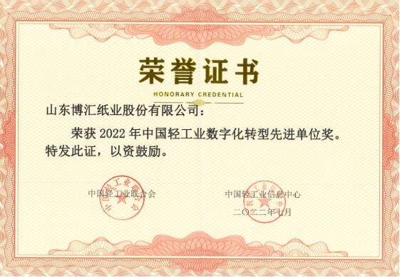 會上,山東博匯紙業(yè)股份有限公司榮獲“2022年中國輕工業(yè)數(shù)字化轉(zhuǎn)型先進單位獎”表彰。