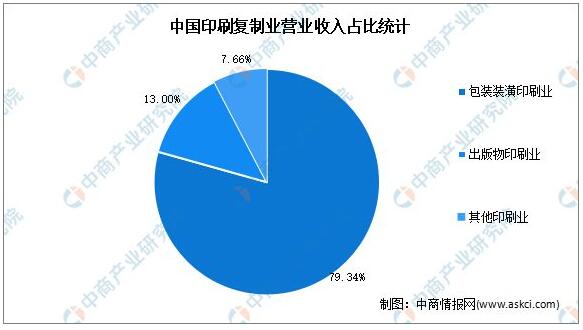 隨著生產(chǎn)工藝、技術(shù)水平的提升以及綠色環(huán)保概念的普及,紙制印刷包裝物因具有生產(chǎn)原料來(lái)源廣泛、成本低、便于物流運(yùn)輸、易于儲(chǔ)存和包裝物可回收等優(yōu)勢(shì),已經(jīng)可以部分取代塑料包裝、金屬包裝、玻璃包裝等多種包裝形式,應(yīng)用范圍越來(lái)越廣。 營(yíng)業(yè)收入占比 印刷包裝產(chǎn)品在滿足大眾化需求的同時(shí),呈現(xiàn)品質(zhì)化、個(gè)性化、定制化趨勢(shì),綠色印刷、數(shù)字印刷迅猛發(fā)展。2020年全國(guó)印刷復(fù)制業(yè)實(shí)現(xiàn)營(yíng)業(yè)收入11991.02億元,利潤(rùn)總額555.02億元。其中,包裝裝潢印刷營(yíng)業(yè)收入9503.31億元,占整個(gè)印刷復(fù)印業(yè)主營(yíng)業(yè)務(wù)收入的比重為79.25%。
