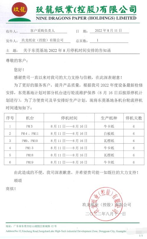 玖龍紙業(yè)再度發(fā)布了東莞基地的停機檢修計劃,8臺包裝紙機自8月11日起停機6天;8月16日后按原停機計劃進行。 根據(jù)設(shè)計產(chǎn)能計算,此次停機的8臺紙機預(yù)計減少箱板瓦楞紙和灰底白板紙供應(yīng)合計約5.21萬噸。