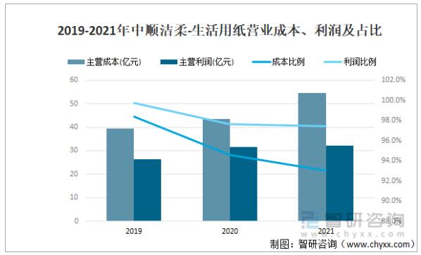 資料來源:公司年報、智研咨詢整理 2021年中順潔柔-生活用紙營業(yè)成本為54.56億元,同比增長25.6%,成本比例為93.05%;中順潔柔-生活用紙主營利潤為32.03億元,同比增長1.5%,成本比例為97.44%。 2019-2021年中順潔柔-生活用紙營業(yè)成本、利潤及占比