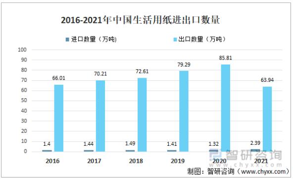 資料來源:中國造紙協(xié)會、智研咨詢整理 一、生活用紙進出口情況 國際生活用紙價格保持高位對國內(nèi)造紙行業(yè)產(chǎn)生了微妙影響。據(jù)中國海關(guān)數(shù)據(jù),2021年中國生活用紙進口數(shù)量為2.39萬噸,同比增長81.1%;生活用紙出口數(shù)量為63.94萬噸,同比下降25.5%。 2016-2021年中國生活用紙進出口數(shù)量