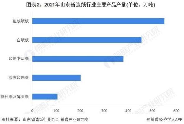 山東造紙業包裝紙板產量最高 從主要產品產量結構來看,目前,山東省造紙行業主要產品仍為包裝紙板、白紙板以及印刷書寫紙等品類為主。2021年,山東省包裝紙板產量為550萬噸,是目前唯一產量突破500萬噸的細分品種;白紙板以及印刷書寫紙產量分別為455萬噸和380萬噸,分別位列山東造紙細分品種二三位。此外,涂布印刷紙和特種紙及薄頁紙產量也在100萬噸以上。