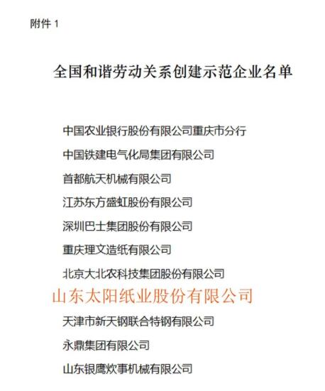 近日,人力資源社會(huì)保障部、中華全國(guó)總工會(huì)、中國(guó)企業(yè)聯(lián)合會(huì)/中國(guó)企業(yè)家協(xié)會(huì)、中華全國(guó)工商業(yè)聯(lián)合會(huì)聯(lián)合印發(fā)《關(guān)于命名全國(guó)和諧勞動(dòng)關(guān)系創(chuàng)建示范企業(yè)與工業(yè)園區(qū)的決定》,太陽(yáng)紙業(yè)榜上有名,榮獲“全國(guó)和諧勞動(dòng)關(guān)系創(chuàng)建示范企業(yè)”稱(chēng)號(hào)。