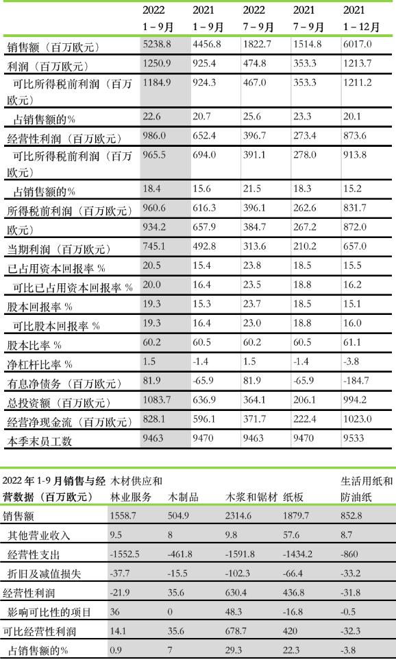 2022年1-9月(2021年1-9月同比數(shù)據(jù)) 銷售額為 52.39 億歐元(同比:44.57 億歐元); 經(jīng)營性利潤為 9.86 億歐元(同比:6.52 億歐元);可比經(jīng)營性利潤為 9.66 億歐元(同比:6.94 億歐元); 稅前利潤為 9.61 億歐元(同比:6.16 億歐元);可比稅前利潤為 9.34 億歐元(同比:6.58 億歐元); 可比已占用資本回報率為 20.0%(同比:16.4%); 經(jīng)營性凈現(xiàn)金流為 8.28 億歐元(同比:5.96 億歐元); 2022年7-9月(2021年7-9月同比數(shù)據(jù)) 銷售額為 18.23 億歐元(同比:15.15 億歐元); 經(jīng)營性利潤為 3.97 億歐元(同比:2.73 億歐元);可比經(jīng)營性利潤為 3.91 億歐元(同比:2.78 億歐元); 稅前利潤為 3.96 億歐元(同比:2.63 億歐元);可比稅前利潤為 3.85 億歐元(同比:2.67 億歐元); 可比已占用資本回報率為 23.5%(同比:18.8%); 經(jīng)營性凈現(xiàn)金流為 3.72 億歐元(同比:2.22 億歐元) 2022年第三季度主要事件 芬林集團(tuán)長纖漿的平均銷售價格環(huán)比上漲。 歐洲和北美市場對芬林紙板生產(chǎn)的折疊紙板需求保持穩(wěn)定。歐洲市場對白牛卡需求略有下降。紙板均價以歐元計環(huán)比上漲。 芬林紙板已啟動卡斯基寧(Kaskinen)年產(chǎn)能 80萬 噸折疊紙板工廠的前期工程設(shè)計,最早可能在 2024 年作出投資決策。 新落成的勞馬(Rauma)松木鋸材廠于 9 月底正式投產(chǎn)。該項(xiàng)目投資額約為 2.6 億歐元。 曼塔(M?ntt?)工廠的生活用紙機(jī)經(jīng)技改后也于 9 月開始正式投產(chǎn)。該項(xiàng)投資將紙機(jī)的產(chǎn)能提高了15%,同時生產(chǎn)效率和能效也得到提升。 芬林集團(tuán)采用道德晴雨表評測企業(yè)文化中的責(zé)任,與兩年前的第一次評測結(jié)果相比,今年的評測結(jié)果有所改善。 俄烏沖突對芬林集團(tuán)業(yè)務(wù)運(yùn)營的影響 俄烏沖突已對芬林集團(tuán)的業(yè)務(wù)運(yùn)營產(chǎn)生一定影響。芬林集團(tuán)在俄羅斯唯一的生產(chǎn)工廠——斯維爾(Svir)鋸材廠目前已中斷運(yùn)營,從該國采購木材的業(yè)務(wù)也已中斷。面向俄羅斯和白俄羅斯的產(chǎn)品交付工作也被迫暫停。 替換俄羅斯木材來源的工作已按計劃進(jìn)行。俄烏沖突和隨之而來的制裁對能源供應(yīng)將產(chǎn)生影響。目前面臨最嚴(yán)峻的挑戰(zhàn)是生產(chǎn)所需的天然氣供應(yīng)和對相關(guān)成本的管理。一系列旨在取代天然氣的措施正在按計劃進(jìn)行中。 新冠病毒疫情 芬林集團(tuán)嚴(yán)格遵守有關(guān)部門發(fā)布的新冠病毒防疫指南。今年 5 月,隨著新冠疫情好轉(zhuǎn),芬林集團(tuán)解除了相關(guān)的限制措施。自 8 月初開始,針對可居家辦公的崗位,芬林集團(tuán)采用了遠(yuǎn)程辦公和現(xiàn)場辦公相結(jié)合的工作模式。新冠疫情期間的資源供給正常,除少數(shù)例外情況,生產(chǎn)和交貨一直正常進(jìn)行。 2022年10-12月的業(yè)績預(yù)測 芬林集團(tuán)預(yù)計2022年10-12月的可比營業(yè)利潤將低于2022年7-9月。