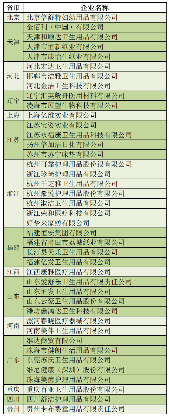 入選《2022年老年用品產(chǎn)品推廣目錄》的成人紙尿褲、護(hù)理墊和濕巾生產(chǎn)企業(yè)(按省市排列)
