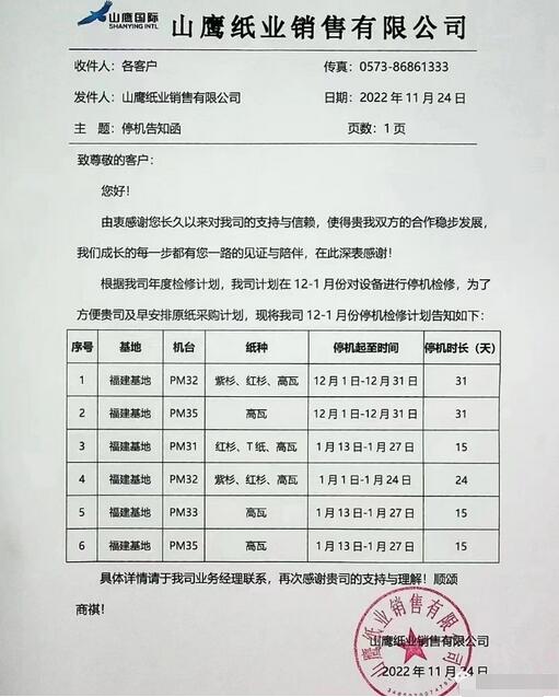 轉眼間,今年12月份即將來臨,2023年就在不遠。值此歲末年初之際,各大紙企的年度停機檢修計劃正在紛紛趕來! 日前,山鷹國際發布停機告知函,其福建基地計劃在2022年12月份到2023年1月份對設備進行停機檢修,4臺紙機將輪流停產15-55天。